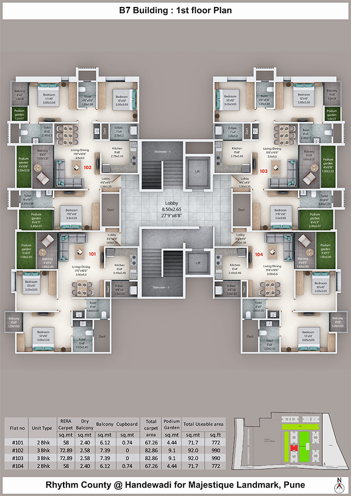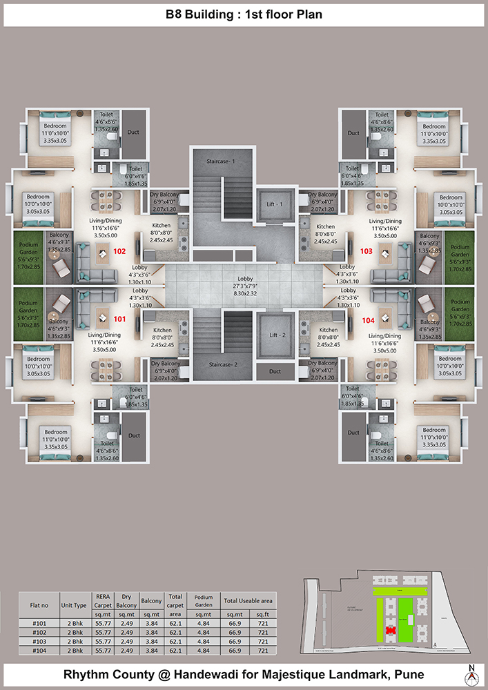 All the units/flats are available with eco-friendly and sustainable features. Majestique Rhythm County is promoting a healthy lifestyle and the project will offer expansive open spaces inside the project only so that residents can avail all the facilities at one center.3 large connected podia